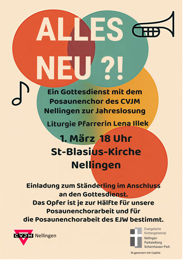 Herzliche Einladung zum Bläsergottesdienst am Sonntag, 1. März, 18:00 Uhr, in der St.-Blasius-Kirche in Nellingen mit dem Posaunenchor des CVJM Nellingen.